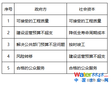 通過以上政府部門及社會資本方戰(zhàn)略關注重點及其排序,可以看出,對于政府方來說,采取PPP模式操作水環(huán)境治理項目一定程度上已經(jīng)解決了政府公共部分預算不足的問題,同時通過簽訂PPP項目合同約定政府方和項目公司之間風險分擔比例也實現(xiàn)了政府方的風險部分轉(zhuǎn)移,因此,PPP項目政府和社會資本所同時關注的戰(zhàn)略重點且能夠在績效考核中實現(xiàn)的主要就三項:可接受的工程質(zhì)量、建設運營預算不超支、合格的公眾服務。而這三項戰(zhàn)略重點又可分為兩大部分,即建設期的建設投資與建設質(zhì)量、運營期的公眾服務質(zhì)量。因而,水環(huán)境治理項目PPP績效考核的目標主要如下表2所示: