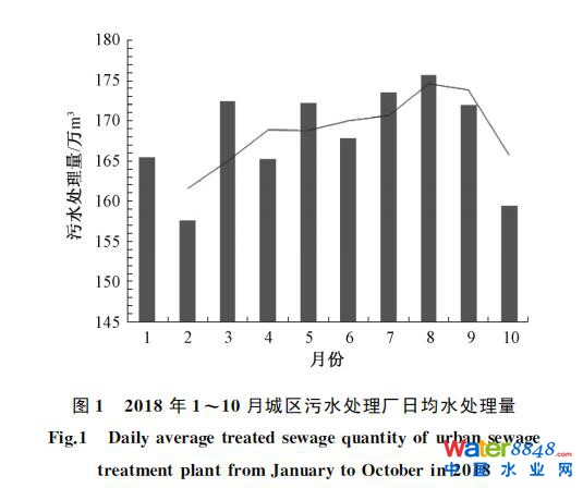 根據(jù)資料,合肥市城區(qū)現(xiàn)有12座污水處理廠, 日均處理水量為157~175萬 m³,污水處理能力接近飽和。產(chǎn)泥量為756~1297t/d(含水率80%), 計算得到平均 產(chǎn)泥率約6tDS/萬 m³ 污 水,平均產(chǎn)泥量約978t/d。表1、圖1、圖2顯示了合肥市中心 城區(qū)目前污水處理量與污泥產(chǎn)出量現(xiàn)況。