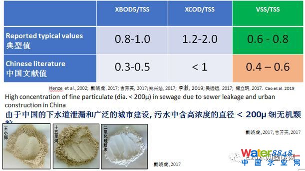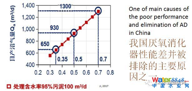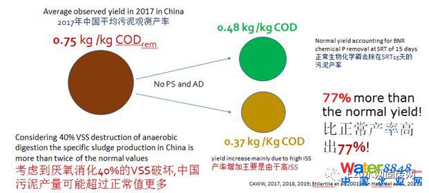 第二,高污泥產(chǎn)量。2017年中國平均污泥產(chǎn)率為每去除一公斤COD產(chǎn)生0.75KG公斤干污泥,意味著比正常值高出77%,考慮到厭氧消化40%的VSS破壞,中國污泥產(chǎn)率可能超過正常值更多。“相當一部分污泥來自進水的無機懸浮固體。”