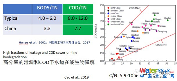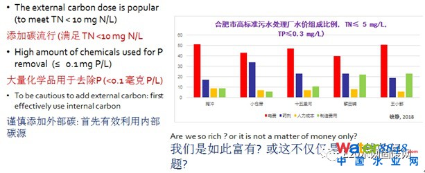 由于碳氮比不夠,外加碳源很普遍。曹業(yè)始指出這個做法的弊端:與此相關(guān)有兩方面問題,第一、實際上進水當中的COD沒有被充分利用;第二,消耗了能源,是不可持續(xù)的。