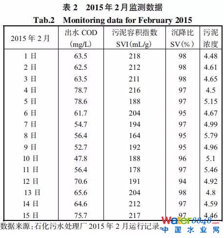這說(shuō)明污泥受到?jīng)_擊,污泥濃度明顯下降,污泥指數(shù)顯著增加,導(dǎo)致出水超標(biāo)。2015年2月初系統(tǒng)逐步恢復(fù)穩(wěn)定,外排COD指標(biāo)已明顯好轉(zhuǎn)。但從生物相分析:3日污泥呈淺褐色,有大量表殼蟲(chóng)、單個(gè)不活躍鐘蟲(chóng),少量絲狀細(xì)菌,菌膠團(tuán)結(jié)構(gòu)松散;5日污泥呈褐色,有大量表殼蟲(chóng)、一定量不活躍鐘蟲(chóng),較多絲狀細(xì)菌,菌膠團(tuán)結(jié)構(gòu)松散;10日污泥呈較深的褐色,有大量表殼蟲(chóng)、少量活躍蟲(chóng),較多絲狀細(xì)菌,菌膠團(tuán)結(jié)構(gòu)松散。這表明污泥系統(tǒng)尚未恢復(fù)良好狀態(tài),其恢復(fù)的真正標(biāo)志是污泥生物系統(tǒng)發(fā)生改善和污泥濃度特別是污泥容積指數(shù)的恢復(fù)。另外,從表2可以看出,污泥指數(shù)的變化趨勢(shì)與出水COD的變化趨勢(shì)在一定范圍內(nèi)基本相同,且具有相關(guān)性。為此,在實(shí)際的生產(chǎn)運(yùn)行中,將污泥濃度、污泥沉降比SV、污泥容積指數(shù)SVI和生物相作為日常監(jiān)測(cè)項(xiàng)目進(jìn)行必要的監(jiān)測(cè),同時(shí)對(duì)測(cè)定結(jié)果進(jìn)行科學(xué)的綜合分析評(píng)價(jià),據(jù)此指導(dǎo)污水裝置的運(yùn)行與調(diào)整。