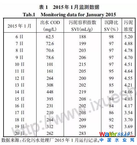2015年1月由于前方廠生產(chǎn)裝置出現(xiàn)事故,一定量高濃度廢水從原有的高濃度污水管線轉(zhuǎn)移到生活管線排放,雖然進(jìn)水COD沒(méi)有明顯增大,但因缺少預(yù)處理,部分難降解有機(jī)物對(duì)純氧曝氣活性污泥有較大的影響,具體數(shù)據(jù)見(jiàn)表1。