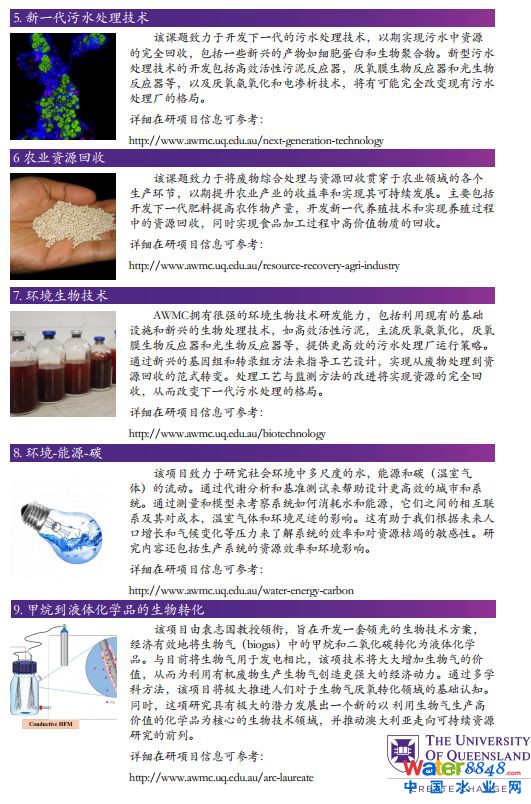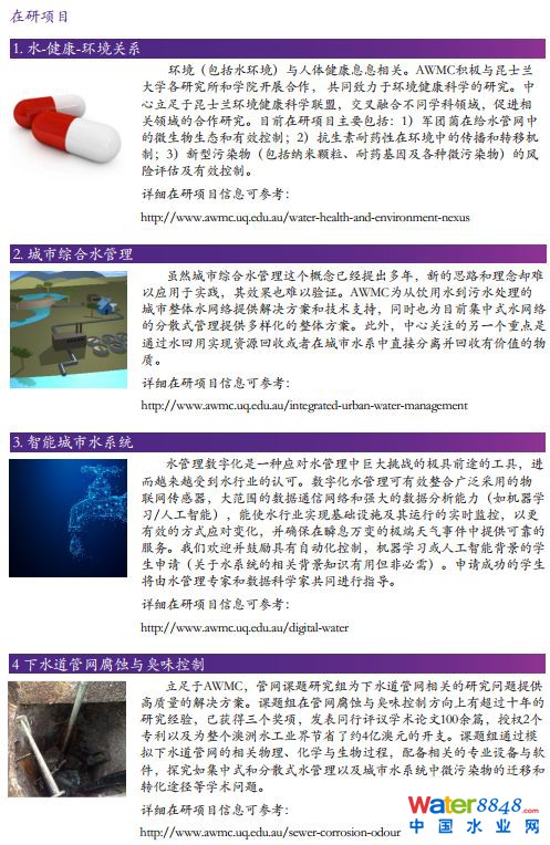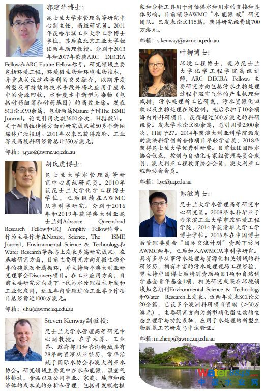 澳大利亞昆士蘭大學(xué)昆士蘭大學(xué)水管理高等研究中心 (Advanced Water Management Centre,AWMC,http://www.awmc.uq.edu.au) 成立于1996年,是目前國(guó)際公認(rèn)的頂尖水處理技術(shù)創(chuàng)新中心之一。水管理高等研究中心由澳大利亞工程院院士,國(guó)際著名環(huán)境工程專家袁志國(guó)教授(Prof. Zhiguo Yuan)領(lǐng)導(dǎo),主要包括水-健康-環(huán)境關(guān)系,城市綜合水管理,智能城市水系統(tǒng),下水道管網(wǎng)腐蝕與臭味控制,新一代污水處理技術(shù)開發(fā),農(nóng)業(yè)資源回收,環(huán)境生物技術(shù)開發(fā),環(huán)境-能源-碳網(wǎng)絡(luò),甲烷的生物轉(zhuǎn)化等九大研究領(lǐng)域。