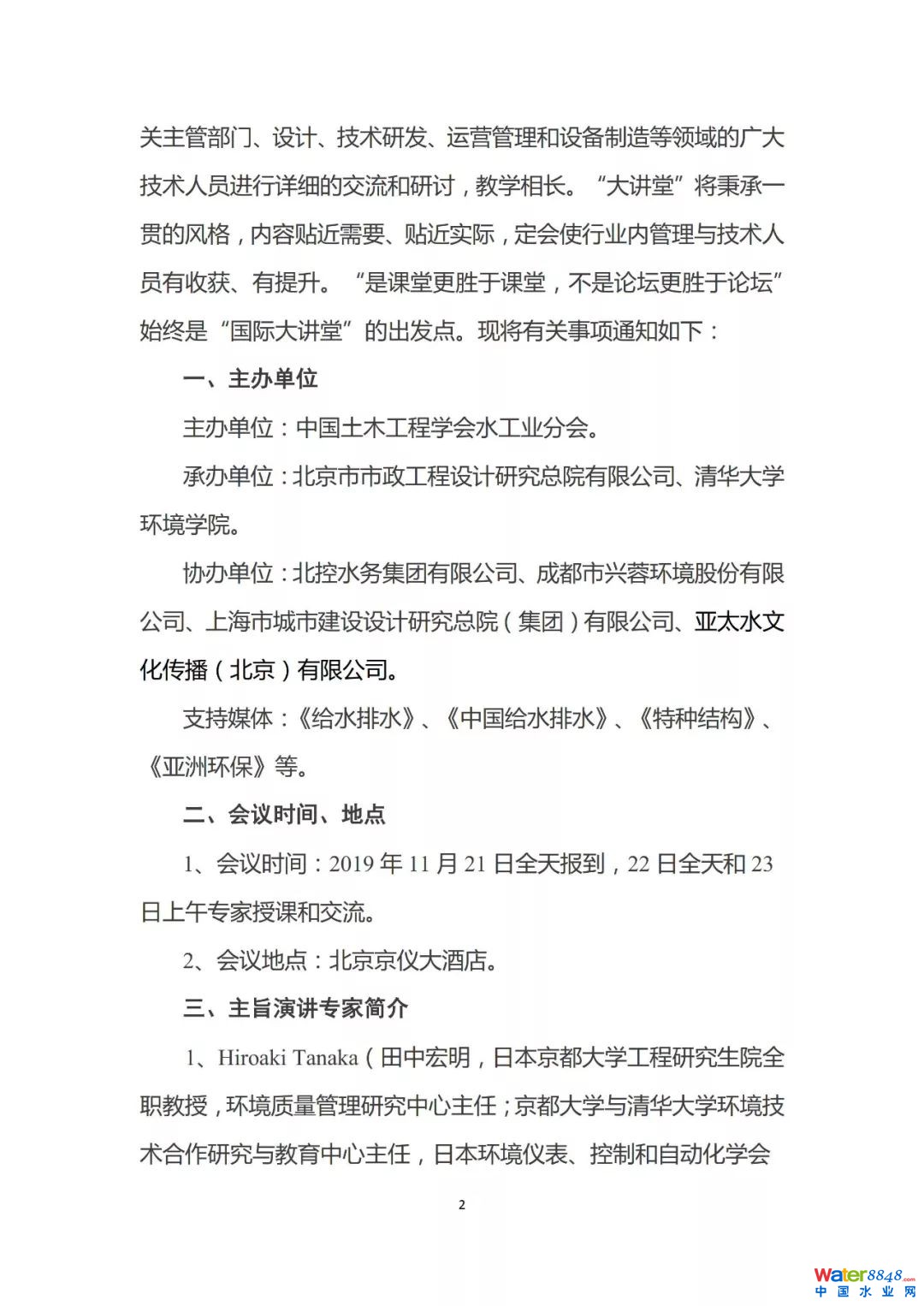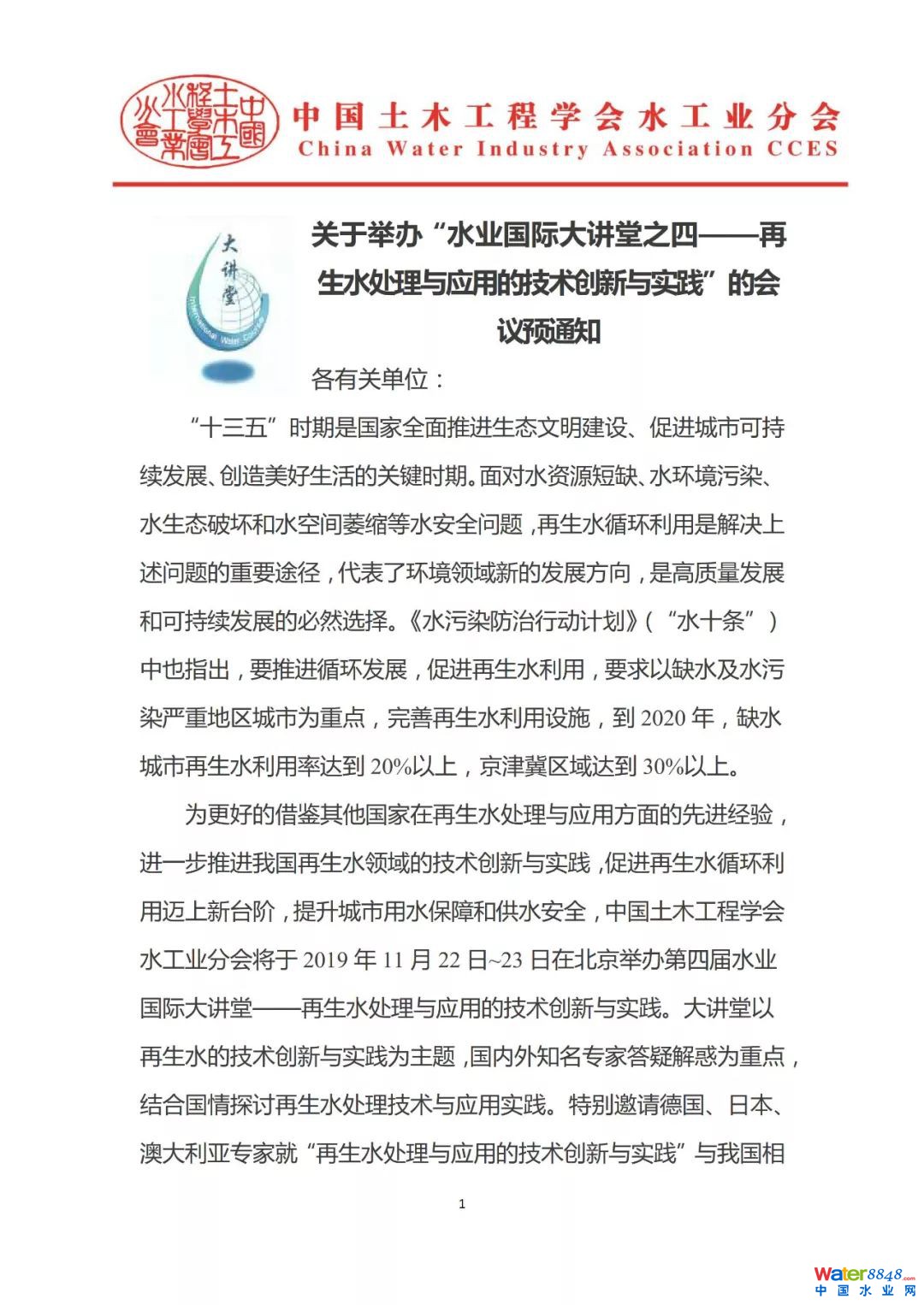 關(guān)于舉辦“水業(yè)國際大講堂之四——再生水處理與應(yīng)用的技術(shù)創(chuàng)新與實(shí)踐”的會(huì)議預(yù)通知