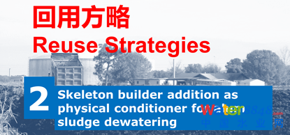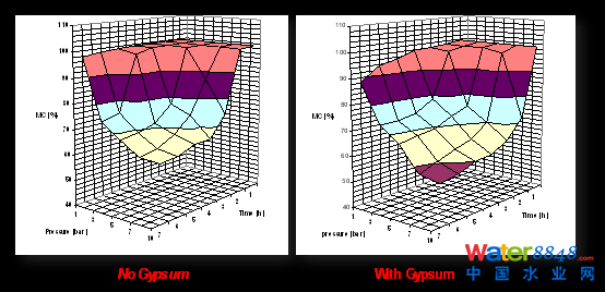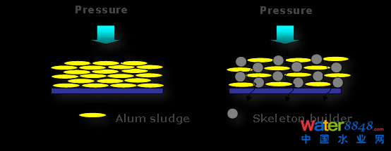 實驗證明,污泥脫水機械壓縮形成泥餅,加大壓力和增加脫水時間,最終泥餅含水率差不多,6小時,8小時,10小時,最終泥餅幾乎一樣。是里面有一些水出不來,再加壓,加時間也出不來。怎么辦?能不能加一種東西,起名字骨架(skeleton builder),骷髏的意思。加一種東西讓它微觀上支撐,微觀上產(chǎn)生微孔道使一些水可以出來。我們最后尋找到石膏(gypsum (CaSO4∙2H2O)),石膏是一種土壤改良劑。我們把它加進去,混合,再加一點Polymer形成污泥礬花(Floc)顆粒進行機械脫水。試驗證明加石膏有這個作用,有我們設(shè)想的從微觀上來說起微觀骨架的作用,再加壓時有更多的水脫出,得到更干的泥餅。