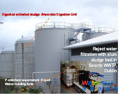 鋁污泥泥餅回用的另一個方略就是用于污水廠污泥處理工藝中上清液,污泥脫水液(Reject water)的處理。我們說生物除磷,這個磷伴隨生物生長,轉(zhuǎn)移到污泥中去,污泥再經(jīng)厭氧消化分解使磷又釋放到上清液和污泥脫水液里。所以磷在打轉(zhuǎn)轉(zhuǎn),回流,循環(huán)。我們把鋁污泥泥餅?zāi)脕,能不能把它作為一個吸附劑搞一個吸附柱,把這個回流污泥水進行吸附。把磷吸附固定在鋁污泥里面。我們選擇了都柏林的一個新建城市污水處理廠, 現(xiàn)場實驗效果非常好,當(dāng)然有吸附飽和和鋁污泥吸附柱更換問題。