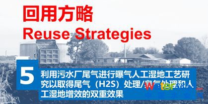 第五個是利用污水處理廠尾氣進行曝氣人工濕地研究。污水處理廠產(chǎn)生臭氣,把這些臭氣進行收集,收集后用作鋁污泥型人工濕地的曝氣氣源。我們研究很多,把收集的污水處理廠臭氣從底部通入鋁污泥型人工濕地系統(tǒng),鋁污泥可以吸附臭氣中的硫化氫,同時給濕地做一點鼓氣作用,促進濕地效果,同時除臭,一舉兩得。