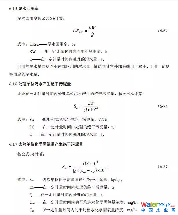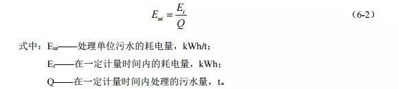 企業(yè)在一定計(jì)量時(shí)間內(nèi)處理單位污水需要消耗的用電量,耗電量僅計(jì)算處理污水達(dá)到要求的排放標(biāo)準(zhǔn)時(shí)所消耗的電量,不含再生利用過程消耗的電能(同時(shí)包括辦公使用的耗電量,不包括基建、生活用耗電量等)。按公式6-2計(jì)算: