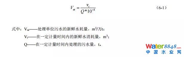 企業(yè)在一定計(jì)量時(shí)間內(nèi)處理單位污水需要從各種水源所取得的新鮮水量,包括工業(yè)生產(chǎn)使用及辦公使用的新鮮水量,不包括基建、生活用新鮮水量等。新鮮水消耗量,包括取自地表水(以凈水廠供水計(jì)量)、地下水、城鎮(zhèn)供水工程,以及企業(yè)從市場(chǎng)購得的其他水或水的產(chǎn)品。按公式6-1計(jì)算: