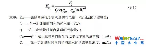 企業(yè)在一定計(jì)量時(shí)間內(nèi)處理單位化學(xué)需氧量需要消耗的用電量,耗電量僅計(jì)算處理污水達(dá)到要求的排放標(biāo)準(zhǔn)時(shí)所消耗的電量,不含再生利用過程消耗的電能(同時(shí)包括辦公使用的耗電量,不包括基建、生活用耗電量等)。按公式6-3計(jì)算: