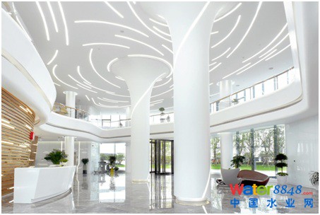 當記者走進威派格總部基地,從室外建筑設計到室內(nèi)的細節(jié)設計,都能感受到水的元素。主辦公樓的造型是一艘漂浮在水面上的游輪,樓層指引是激起的水滴,廠區(qū)內(nèi)也是園林化設計。