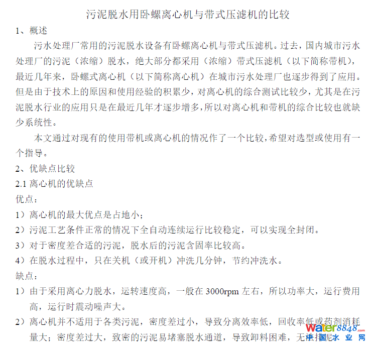 污泥脫水用臥螺離心機與帶式壓濾機的比較