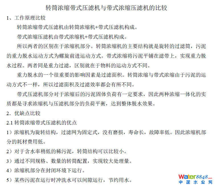 轉筒濃縮壓濾機與帶式濃縮壓濾機的比較 污泥脫水用臥螺離心機與帶式壓濾機的比較 疊螺脫水機與帶式壓濾機的比較