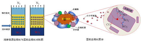 固相反硝化脫氮是指以不溶于水的固相碳源作為反硝化微生物的碳源及生物膜的附著載體,通過(guò)微生物自身釋放的胞外酶將固相碳源按需水解為溶解性的小分子有機(jī)物,反硝化微生物利用該部分有機(jī)物進(jìn)行生物反硝化過(guò)程。