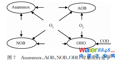 在主流厭氧氨氧化工藝中,主要有Anammox菌、AOB、NOB、普通異養(yǎng)菌(OHO),這些微生物共存于一個系統(tǒng)中,對不同的基質(zhì)形成了非常復(fù)雜的競爭關(guān)系,主要有AOB與NOB對氧的競爭(DO的控制水平、曝氣的時間)、NOB與Anammox菌對亞硝酸鹽氮的競爭(不同的亞硝酸鹽氮半飽和濃度及不同的溫度敏感性)以及異養(yǎng)菌與NOB對亞硝酸鹽氮的競爭,如圖7所示,如何控制這些微生物處于合理的水平無論是對于微生物的認(rèn)知還是控制手段的優(yōu)化都是巨大的挑戰(zhàn)。