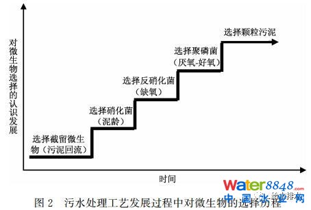 活性污泥工藝從誕生至今一直不斷經(jīng)歷著“選擇”的過程,早期的污泥回流使微生物選擇留在系統(tǒng)中,起到了最為關(guān)鍵的作用;此后,人們通過基本的長泥齡方式而使硝化菌在系統(tǒng)中選擇地存在;而生物除磷工藝的出現(xiàn),則是通過厭氧-好氧的交替環(huán)境選擇性地使聚磷菌(PAOs)在系統(tǒng)中存在,可以看出對微生物的選擇過程一直伴隨著污水處理工藝的發(fā)展,如圖2所示。當(dāng)然,在這一系列的基本選擇過程中,還有其他因素的影響,比如硝化過程中對DO的需求、生物除磷過程對VFA的需求等。