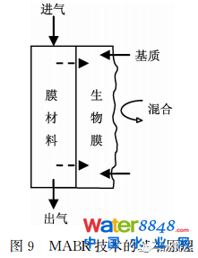 近些年來,在曝氣利用效率方面一項頗具發(fā)展?jié)摿Φ纳锬ぜ夹g(shù)是MABR(Membrane Aerated Biofilm Reactor,即膜曝氣生物膜反應(yīng)器)引起業(yè)內(nèi)的廣為關(guān)注,并被眾多研究者廣為看好。MABR的主要原理是采用空氣在膜絲中進(jìn)入,生物膜附著于膜材料表面上(如圖9所示),曝氣的氧利用效率得到了極大的提高。傳統(tǒng)微孔曝氣技術(shù)的氧轉(zhuǎn)移率通常為1~2 kg O2/k·Wh,而MABR可以達(dá)到6 kg O2/kW·h以上,節(jié)能效果非常顯著。