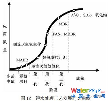 污水處理技術(shù)系統(tǒng)在其生命周期之中,總是沿著提高其理想度向最理想系統(tǒng)的方向進(jìn)化,提高理想度法則代表著所有技術(shù)系統(tǒng)進(jìn)化法則的最終方向。理想化是推動技術(shù)進(jìn)化的主要動力。在當(dāng)前的污水處理技術(shù)中,主流厭氧氨氧化還處于萌芽期向成長期的發(fā)展階段,在世界上的一些地方中試正在進(jìn)行,有極個別的生產(chǎn)性規(guī)模的污水處理廠也正在探索。作為好氧顆粒污泥技術(shù)的代表,Nereda工藝實(shí)際上已經(jīng)進(jìn)入了成長期的階段,當(dāng)然其作為好氧顆粒污泥工藝的反映,還可能處于第一代的水平,未來的發(fā)展還會出現(xiàn)性能更佳的好氧顆粒污泥技術(shù)。圖12是一些污水處理工藝在S-曲線上的位置反映。