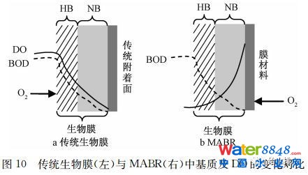 MABR工藝的另外一個特點(diǎn)是基質(zhì)擴(kuò)散的相反梯度,如圖10所示。在傳統(tǒng)的生物膜工藝中,BOD、NH3-N、DO的濃度隨著由液相向生物膜的擴(kuò)散過程中而濃度逐漸降低,這種情對于硝化是不利的,需要有足夠的DO能夠穿透進(jìn)入生物膜內(nèi)部,而這樣對生物膜外層的異養(yǎng)菌反硝化又是不利的。