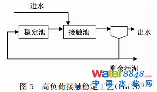 在對HRAS工藝機(jī)理認(rèn)識不斷深入的同時,一些衍生工藝也得到了發(fā)展,并展現(xiàn)出更好的發(fā)展勢頭,其中之一便是高負(fù)荷接觸穩(wěn)定工藝(見圖5)。傳統(tǒng)接觸穩(wěn)定工藝是1922年Coombs在英國開創(chuàng),一般SRT>3 d,通常目的是為了減少反應(yīng)池的池容。HiCS工藝的SRT一般為0.2~3 d,是HRAS和接觸穩(wěn)定工藝的相互結(jié)合,生物吸附能力更強(qiáng),所需的池容更小,污水的碳轉(zhuǎn)向效率更高。