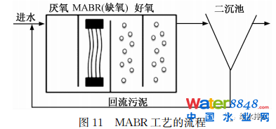 在具體應(yīng)用上,MABR工藝可以單獨(dú)使用,或是與傳統(tǒng)活性污泥工藝相結(jié)合,在曝氣池的前部設(shè)置厭氧區(qū)用于生物除磷,在中部位置放置MABR單元,其余部分仍然采用微孔曝氣的活性污泥工藝(如圖11所示),這樣懸浮污泥可以利用進(jìn)水中的碳源實(shí)現(xiàn)反硝化,而附著于MABR膜上的生物膜完成硝化過程,從而有效地避免了有機(jī)物與硝化對DO的競爭問題,這樣的工藝設(shè)置不僅節(jié)能還能大幅度降低池容。