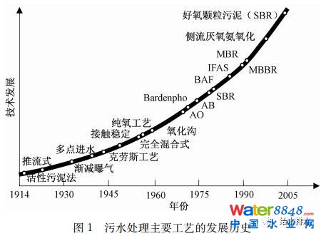1914年,英國人Ardern、Lockett發(fā)明了活性污泥工藝,這一事件成為了現(xiàn)代污水發(fā)展的起點(diǎn)和重要的標(biāo)志性事件。自那以后,活性污泥工藝成為污水處理的主流處理技術(shù),圍繞著活性污泥工藝,污水處理技術(shù)獲得了長足的發(fā)展,出現(xiàn)了百花齊放的技術(shù)格局。