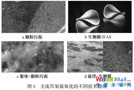 目前,國際上主流厭氧氨氧化的技術(shù)發(fā)展路線大致有四類:顆粒污泥、絮體+顆粒污泥、生物膜/IFAS以及懸浮+生物膜的形式形式,如圖6所示。