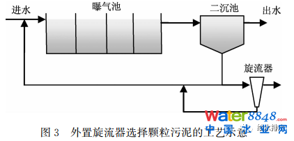 從好氧顆粒污泥的技術(shù)發(fā)展進(jìn)程來看,以Nereda為代表的好氧顆粒污泥技術(shù)實(shí)際上是一種利用內(nèi)在基質(zhì)選擇顆粒污泥的過程,內(nèi)在基質(zhì)選擇的一個關(guān)鍵因素是需要有足夠高的基質(zhì)濃度來形成顆粒,并促使形成較高含量的胞外聚合物(EPS)及胞內(nèi)儲存物,這種方式要求將沉淀較慢的絮體污泥排除系統(tǒng),保留下沉淀較快的顆粒污泥,為了避免出水SS較高,可能需要有一個后置的過濾系統(tǒng)。Nereda這種SBR的技術(shù)形式在很大程度上限制了對現(xiàn)有污水處理廠的改造,因?yàn)榻^大部分污水處理廠并不是SBR工藝。因此,在推流式工藝上采用外置選擇器的方式在近年來得到了快速的發(fā)展,外置選擇器可以是篩網(wǎng)或旋流器,篩網(wǎng)是利用顆粒的粒徑來截留較大的顆粒污泥,旋流器是利用顆粒污泥密度較大的特點(diǎn)而在底流中獲得較高比例的顆粒污泥,如圖3所示。