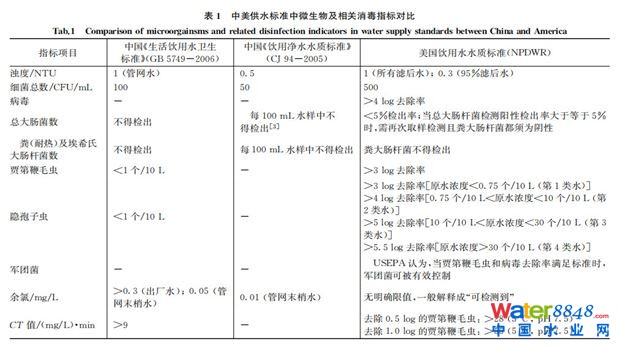 1 中美兩國飲用水微生物標準的對比