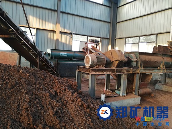 污泥和黏土經(jīng)過配料進(jìn)行預(yù)混合,然后混合后的物料進(jìn)入陳華庫(kù)進(jìn)行陳化儲(chǔ)存。陳化合格物料由鏟車上料至箱式喂料機(jī),箱式喂料機(jī)將物料喂至皮帶輸送機(jī)上,然后通過皮帶輸送機(jī)輸送至雙軸攪拌機(jī)進(jìn)行攪拌。經(jīng)過雙軸攪拌機(jī)攪拌后的物料被輸送至對(duì)輥造粒機(jī)進(jìn)行擠壓造粒。造完的生料球經(jīng)過整形篩進(jìn)行篩分,整形篩將5mm以下的不合格陶粒篩除,合格的陶粒送至窯尾頂部的下料管,進(jìn)入回轉(zhuǎn)窯內(nèi)。下料管上端設(shè)置雙重閘板閥,起到鎖風(fēng)的作用,使得物料進(jìn)入窯尾時(shí)不會(huì)有氣體溢出,不合格的物料被篩分下來。