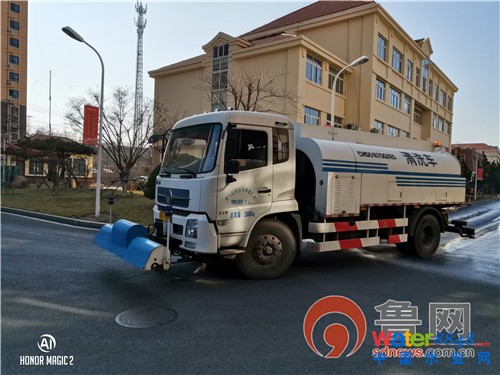 環(huán)境公司團(tuán)島污水處理廠高壓清洗車在廠區(qū)內(nèi)噴灑消毒藥劑 (攝影:紀(jì)桓尚
