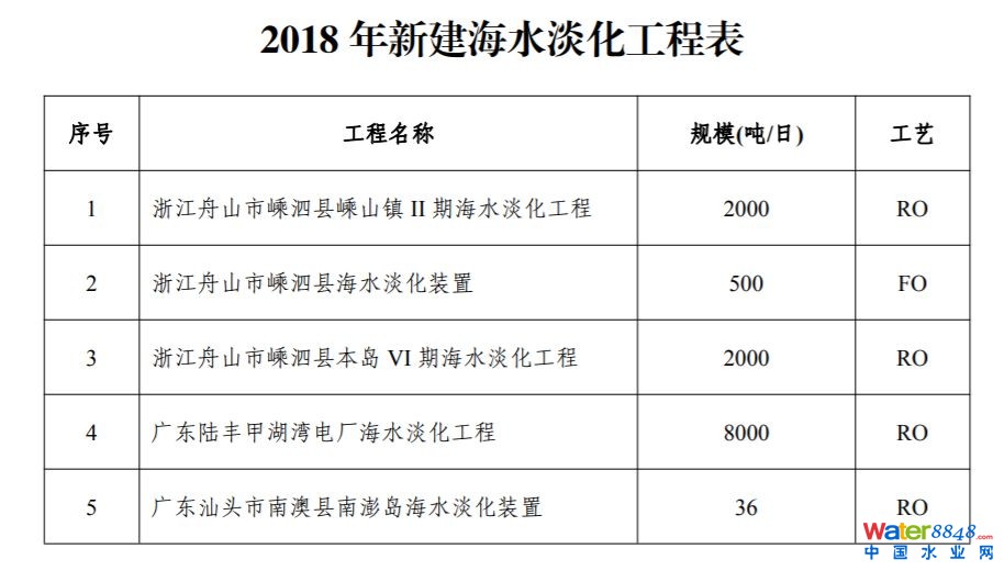 數(shù)據(jù)顯示,2018年,全國新建成海水淡化工程5個(gè),新增規(guī)模為日均1.25萬噸,分布在浙江和廣東,主要用于海島生活用水和沿海城市工業(yè)用水。全國已建成萬噸級(jí)及以上海水淡化工程36個(gè),已建成的最大海水淡化工程單體規(guī)模為日均20萬噸。