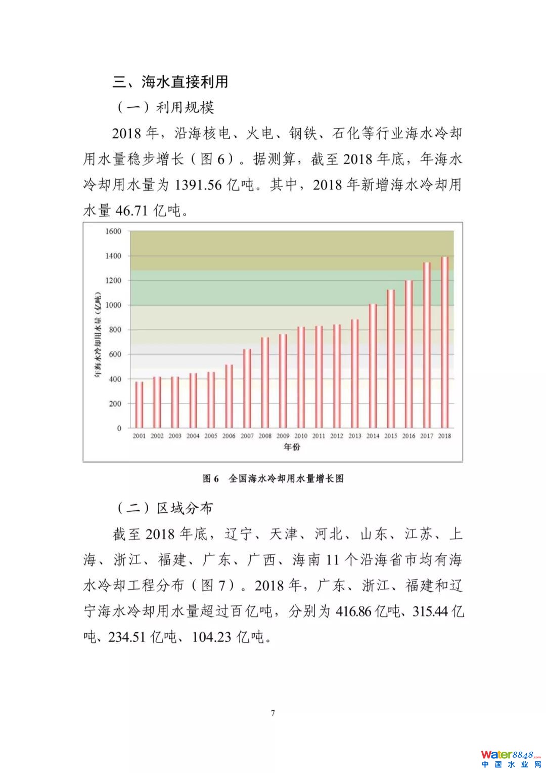 報(bào)告顯示,2018年,中國沿海核電、火電、鋼鐵、石化等行業(yè)海水冷卻用水量穩(wěn)步增長。據(jù)測(cè)算,截至2018年底,年海水冷卻用水量為1391.56億噸。其中,2018年新增海水冷卻用水量46.71億噸。