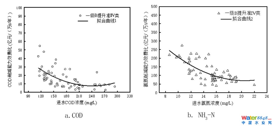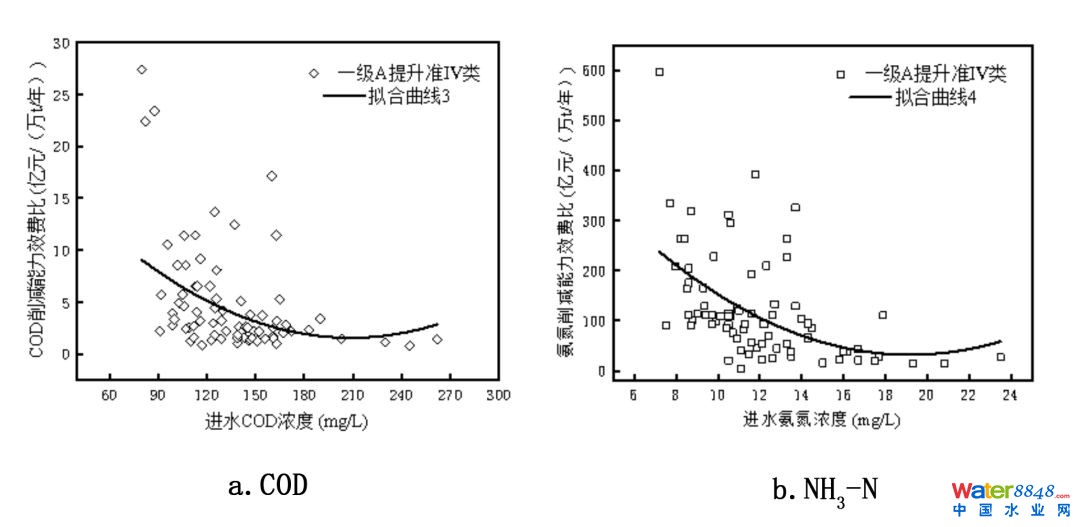 理想情況下的城鎮(zhèn)污水處理提質(zhì)增效投入分析結(jié)果顯示,提高污水管網(wǎng)覆蓋率以及老舊污水管網(wǎng)改造和破損修復(fù)能夠顯著提升城鎮(zhèn)污水處理廠COD、氨氮削減效能。通過對(duì)各城鎮(zhèn)污水處理廠實(shí)際運(yùn)行中進(jìn)水COD、氨氮濃度與投入產(chǎn)出費(fèi)效比進(jìn)行曲線擬合,分析東莞市污水處理提質(zhì)增效側(cè)重點(diǎn)。東莞市執(zhí)行一級(jí)B和一級(jí)A標(biāo)準(zhǔn)的城鎮(zhèn)污水處理廠提升至準(zhǔn)Ⅳ類,擬合結(jié)果如圖1、2所示。