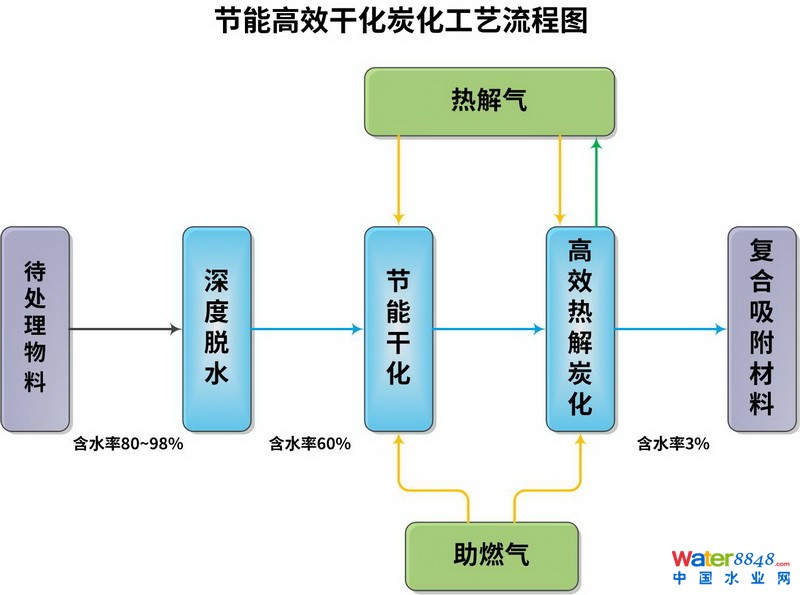 污泥炭化技術(shù)是指市政污泥、工業(yè)油泥、餐廚垃圾等廢棄物,經(jīng)過(guò)深度脫水、節(jié)能干化、高效熱解炭化過(guò)程,制得復(fù)合吸附材料的減量化、穩(wěn)定化、無(wú)害化、資源化的技術(shù)。高效熱解炭化階段產(chǎn)生的熱解氣可以為節(jié)能干化及高效炭化系統(tǒng)供能,降低整個(gè)系統(tǒng)能耗。污泥中的病原體和持久性有機(jī)物被炭化,重金屬則被固化,不會(huì)對(duì)環(huán)境造成二次污染。復(fù)合吸附材料呈黑色,顆粒狀,與工業(yè)用碳的形態(tài)相似,經(jīng)檢測(cè)合格后可作為復(fù)合吸附材料。復(fù)合吸附材料可以再生循環(huán)利用,可廣泛應(yīng)用于傳統(tǒng)活性炭領(lǐng)域,處理廢水廢氣、替代建筑材料輔材、土壤改良及土壤修復(fù)、富營(yíng)養(yǎng)化水體及藍(lán)藻治理等改善環(huán)境,同時(shí)可作為低值燃料,真正實(shí)現(xiàn)資源化利用。