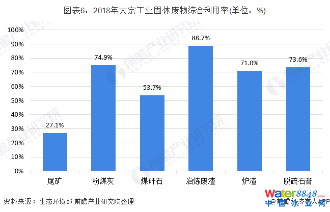 結合大宗工業(yè)固體廢物產生量來看,2018年大宗工業(yè)固體廢物綜合利用率較高,除尾礦和煤矸石之外,綜合利用率均在70%以上,其中冶煉廢渣綜合利用率較高,達到88.7%。
