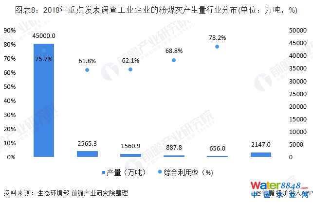 根據生態(tài)環(huán)境部統(tǒng)計數據,粉煤灰生產量較大的行業(yè)是電力、熱力生產和供應業(yè),其產生量為4.5億噸,綜合利用率為75.7%;其次是化學原料和化學制品制造業(yè),有色金屬冶煉和壓延加工業(yè),石油、煤炭及其他燃料加工業(yè),造紙和紙制品業(yè),其產生量分別為2565.3萬噸、1560.9萬噸、887.8萬噸和656.0萬噸,綜合利用率分別為61.8%、62.1%、68.8%和78.2%。