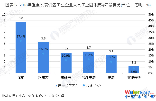 根據生態(tài)環(huán)境部統(tǒng)計數據,2018年重點發(fā)表調查工業(yè)企業(yè)尾礦產生量為8.8億噸,占重點發(fā)表調查工業(yè)企業(yè)一般固體廢物產生量的27.4%;其次是粉煤灰,產量達到5.3億噸,占比為16.6%;除此之外,產量較大的還有煤矸石、冶煉廢渣以及爐渣,產量均在3億噸以上。