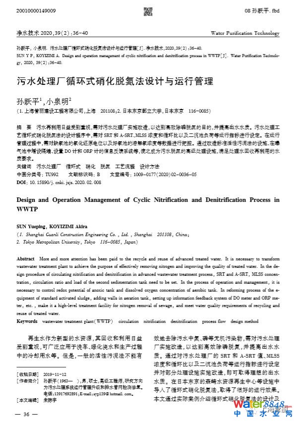 孫躍平 小泉明:污水處理廠循環(huán)式硝化脫氮法設(shè)計與運行管理