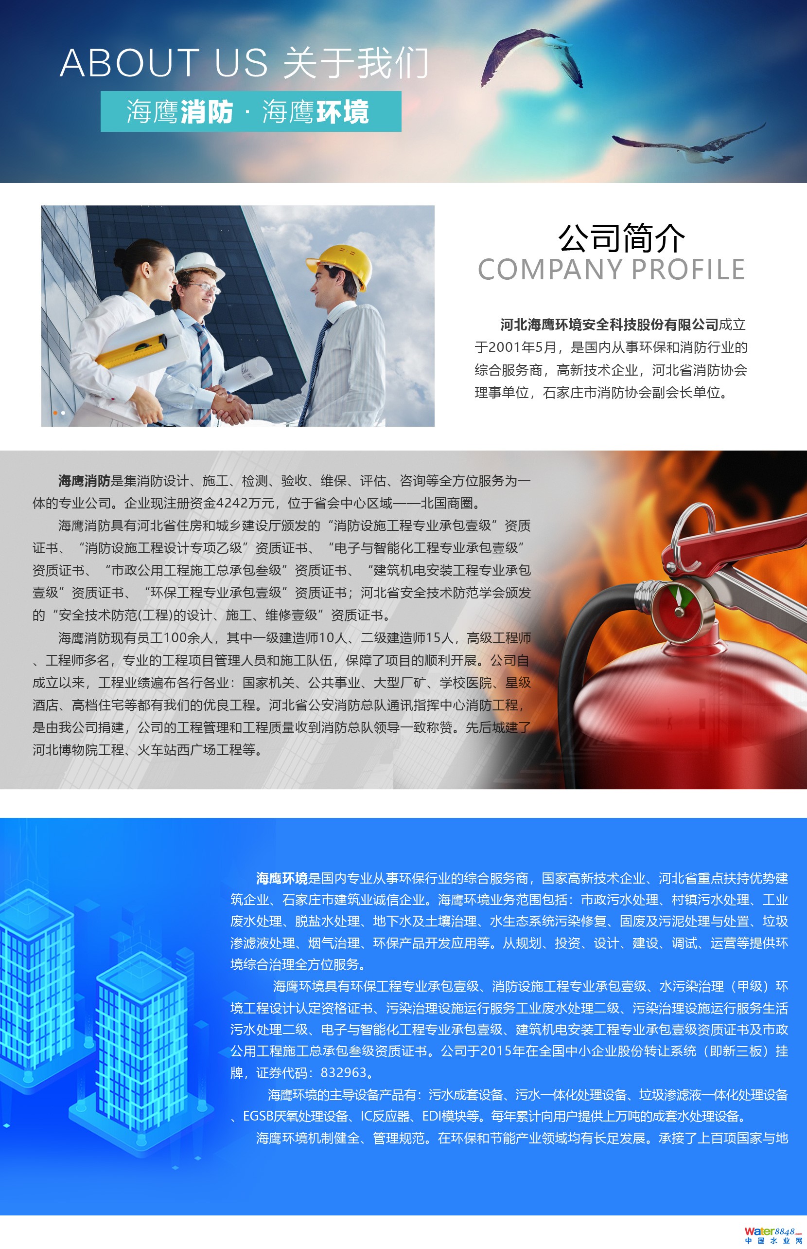 河北海鷹環(huán)境安全科技股份有限公司成立于2001年5月,是一家從事消防、環(huán)保工程的專業(yè)公司,注冊資金3200萬元。公司在創(chuàng)業(yè)之初以消防工程專業(yè)承包起家,具有國家建設部頒發(fā)的“消防設施工程專業(yè)承包”資質證書和“消防設施工程設計專項乙級”資質證書,自成立以來現在全省各地承接了大小幾百項工程,并有多項工程榮獲省優(yōu)、市優(yōu)稱號。