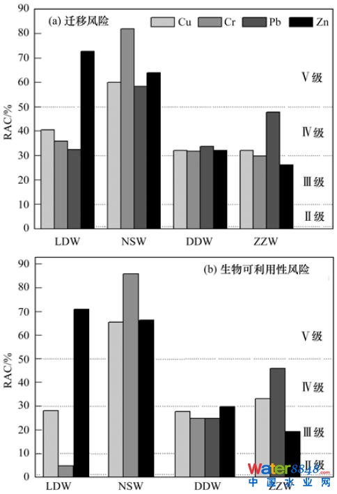 據(jù)生物可利用態(tài)重金屬最大萃取量,LDW中Cu、 Cr和Zn生物可利用態(tài)分別為重金屬總量的28.1%、 4.8%和70.9%; NSW中Cu、 Cr和Zn生物可利用態(tài)分別為總量的65.5%、 86.0%和66.4%; DDW中Cu、 Cr、 Pb和Zn生物可利用態(tài)分別占總量的27.7%、 24.9%、 24.9%和29.8%; ZZW中Cu、 Pb和Zn分別占總量的33.1%、 46.0%和19.2%.總體而言,污泥酸性越強(qiáng),其中重金屬的生物可利用性越高,這與重金屬形態(tài)可遷移性一致.