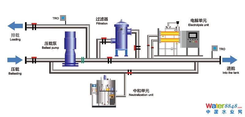 第2步:“電解海水產(chǎn)生次氯酸鈉殺菌”– 從壓載水主管路取一個小流量的海水流過電解裝置,電解產(chǎn)生高濃度的次氯酸鈉溶液,該溶液經(jīng)過除氣后,回注入壓載水主管路,同主管路壓載水混合稀釋至特定濃度。該濃度的次氯酸鈉能夠有效殺滅經(jīng)過濾后的殘余的浮游生物、病原體及其幼蟲或孢子等,達到規(guī)定的殺菌效果(D-2以及其他標準),壓載水管路中活性物質(zhì)的濃度由TRO分析儀和控制系統(tǒng)自動控制;