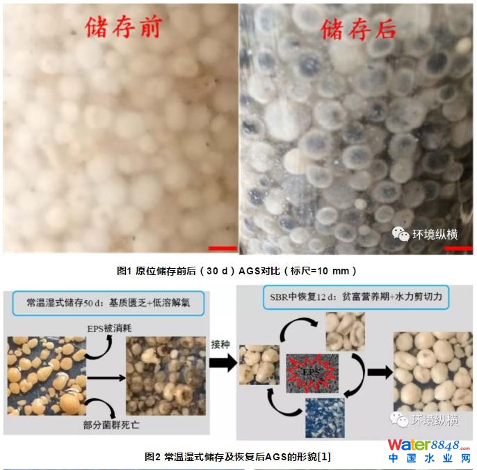 好氧顆粒污泥(aerobic granular sludge, AGS)是水處理領域的研究熱點,呈現(xiàn)給大眾的形象通常是致密的結(jié)構(gòu)、良好的沉降性能及優(yōu)異的去污能力等。然而,與其他生物反應過程類似,AGS工藝亦不可避免的存在檢修、閑置或停運過程,而運行條件的改變無疑會對AGS的穩(wěn)定性造成沖擊,因而AGS儲運引起了學者的關注。另一方面,AGS的形成條件較為苛刻且耗時較長,是學者們努力克服的又一難點。值得注意,已有研究表明儲存后的AGS可在短期內(nèi)恢復常態(tài)功能,耗時明顯短于從活性污泥到AGS的顆;^程,表明AGS的儲運具有較好的應用潛力。為有效利用AGS資源,江西理工大學龍焙博士對AGS的儲運及恢復性能進行了研究。