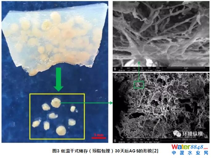 目前,AGS的儲存技術可分為原位儲存和異位儲存兩類。使用停運或閑置的反應器“原位”儲存AGS操作簡便且無需額外占用空間,但這種儲存方式下的AGS會喪失大部分活性,并出現(xiàn)顏色變黑、EPS含量降低、VSS減小、SVI增大,甚至出現(xiàn)顆粒的局部解體或破碎(圖1)。AGS的異位儲存主要包括濕式儲存和干式儲存,其中濕式儲存應用最為普遍。對比常溫濕式敞口及常溫密閉儲存AGS的效果,結(jié)果表明兩種環(huán)境下的儲存效果相當,均出現(xiàn)了AGS的顏色會變黑,并伴隨著EPS含量、SOUR和脫氫酶活性顯著減小,甚至形成大量中空狀AGS(圖2)。但將儲存后的AGS重新曝氣,其可在12天內(nèi)恢常態(tài)所具有的優(yōu)異的理化特性及良好的污染物去除效果。瓊脂包埋法是AGS干式儲存的常用方法。將AGS在4℃下干式儲存30天后發(fā)現(xiàn),AGS外表變得粗糙、表面形成大量孔洞,但未出現(xiàn)變黑及解體現(xiàn)象(圖3),MLVSS、EPS及SOUR分別下降了62.5%、86%及72.4%;將儲存后的AGS重新曝氣后可在11天內(nèi)恢復正常,并監(jiān)測到AGS中的優(yōu)勢菌由儲存前的Zoogloea,Thauera和Clostridium_sensu_stricto轉(zhuǎn)變?yōu)閮Υ婧蟮腁cidovorax,Macellibacteroides和Pseudoxanthomonas。