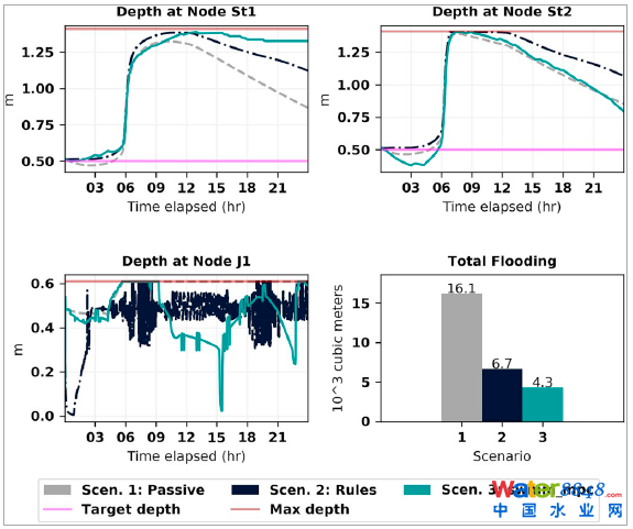 本研究構(gòu)建了如圖2所示的虛擬案例區(qū)域排水系統(tǒng),其控制設(shè)施包括2個(gè)調(diào)蓄池和2個(gè)閘門(mén)。優(yōu)化目標(biāo)為調(diào)蓄池利用率和內(nèi)澇量。本研究比較了無(wú)控制、靜態(tài)規(guī)則控制、模型預(yù)測(cè)控制等三類(lèi)控制算法的控制效果,模擬結(jié)果如圖3所示,可見(jiàn)模型預(yù)測(cè)控制的內(nèi)澇控制效果最佳。