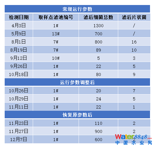 由表中數(shù)據(jù)可見,試運(yùn)行措施啟動(dòng),能顯著降低濾后細(xì)菌總數(shù), 芽孢桿菌有逐漸減少并穩(wěn)定的趨勢(shì)。