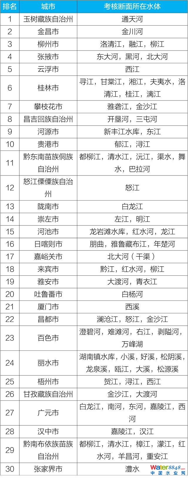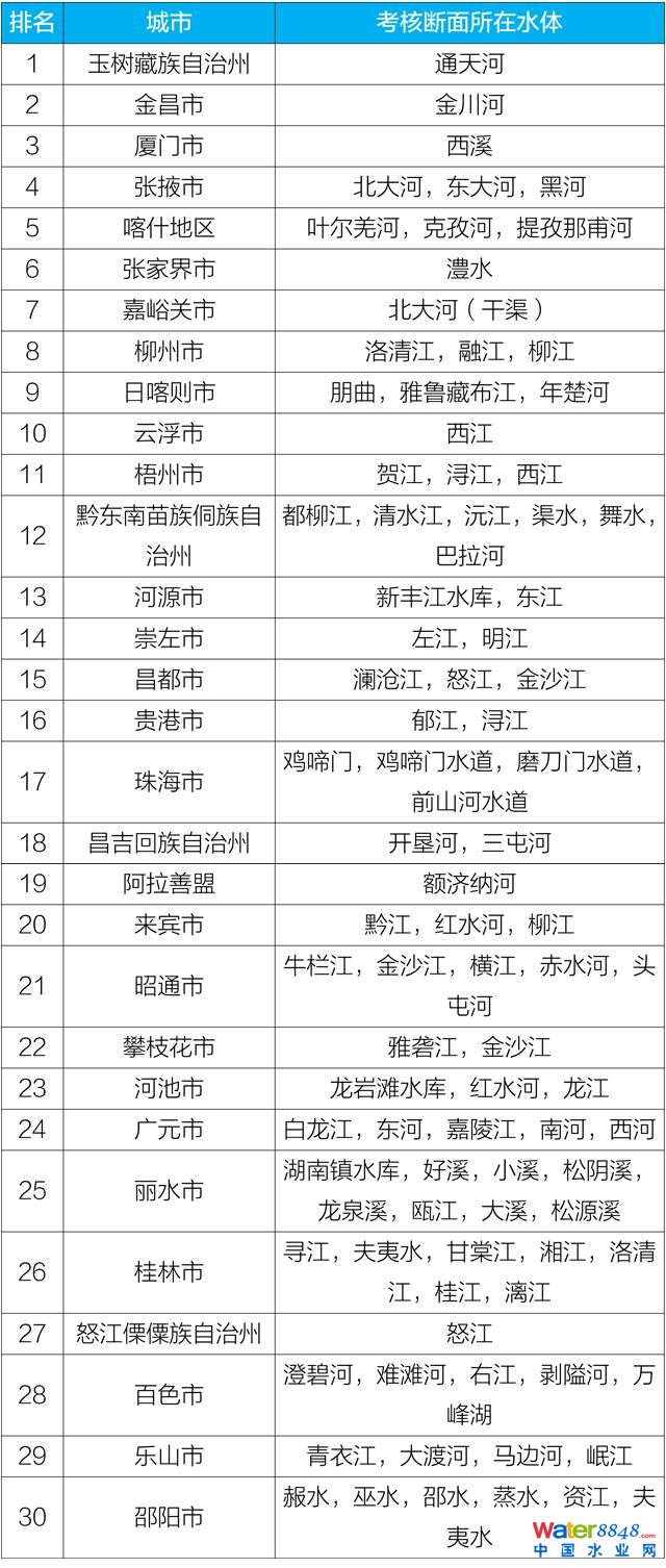 2020年3月國家地表水考核斷面水環(huán)境質(zhì)量狀況排名前30位城市及所在水體