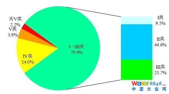 3月,1940個國家地表水考核斷面中,水質(zhì)優(yōu)良(Ⅰ-Ⅲ類)斷面比例為79.9%,同比上升5.6個百分點;劣Ⅴ類斷面比例為2.1%,同比下降3.4個百分點。主要污染指標為化學需氧量、總磷和高錳酸鹽指數(shù)。
