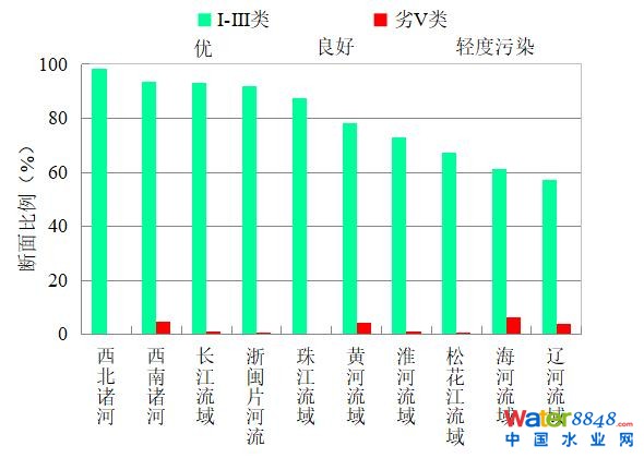 1-3月,長江、黃河、珠江、松花江、淮河、海河、遼河等七大流域及西北諸河、西南諸河和浙閩片河流Ⅰ-Ⅲ類水質(zhì)斷面比例為82.8%,同比上升6.5個百分點;劣Ⅴ類為2.1%,同比下降4.6個百分點。主要污染指標為化學需氧量、氨氮和高錳酸鹽指數(shù)。其中,西北諸河、長江流域、浙閩片河流、西南諸河和珠江流域水質(zhì)為優(yōu),黃河流域水質(zhì)良好,淮河、松花江、海河和遼河流域為輕度污染。