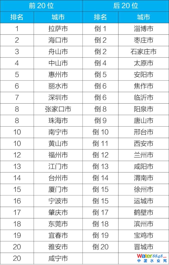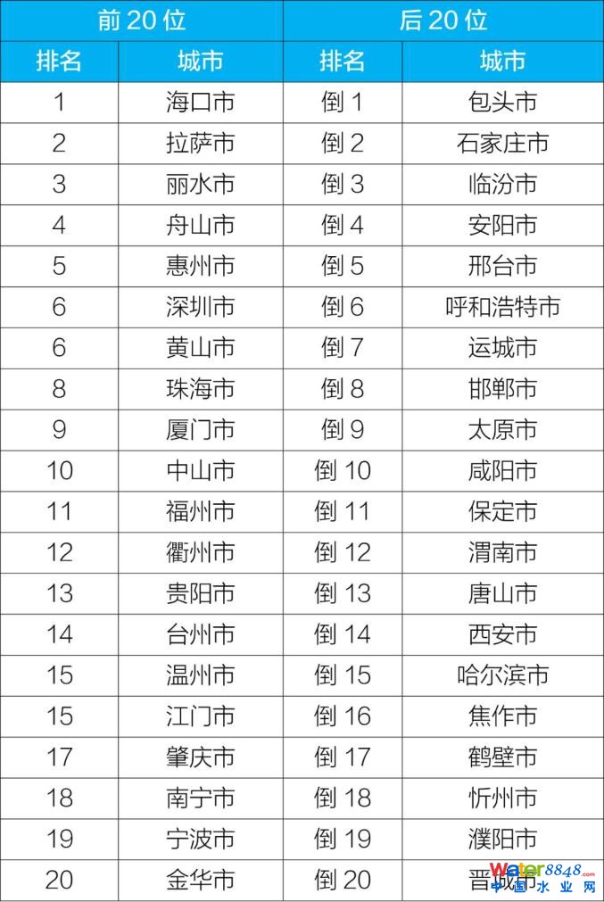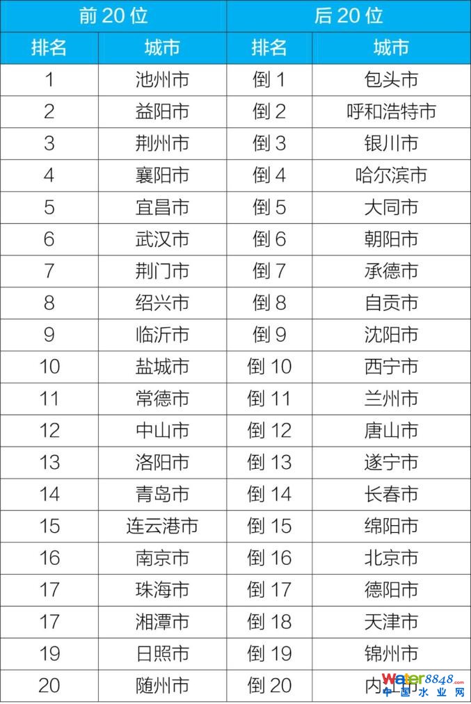 參加排名的全國地級及以上城市,覆蓋2050個國控斷面(其中1940個為國家地表水考核斷面,110個為入?刂茢嗝妫。3月,全國地級及以上城市中,玉樹、金昌、廈門等30個城市國家地表水考核斷面水環(huán)境質(zhì)量相對較好(從第1名到第30名),銅川、錫林郭勒、滄州等30個城市國家地表水考核斷面水環(huán)境質(zhì)量相對較差(從倒數(shù)第1名到倒數(shù)第30名);1-3月,全國地級及以上城市中,玉樹、金昌、柳州等30個城市國家地表水考核斷面水環(huán)境質(zhì)量相對較好(從第1名到第30名),銅川、滄州、邢臺等30個城市國家地表水考核斷面水環(huán)境質(zhì)量相對較差(從倒數(shù)第1名到倒數(shù)第30名);呂梁、營口和晉中等30個城市國家地表水考核斷面水環(huán)境質(zhì)量變化情況相對較好(從第1名到第30名),銅川、大理和赤峰等30個城市國家地表水考核斷面水環(huán)境質(zhì)量變化情況相對較差(從倒數(shù)第1名到倒數(shù)第30名)。詳細見附表1~附表6。